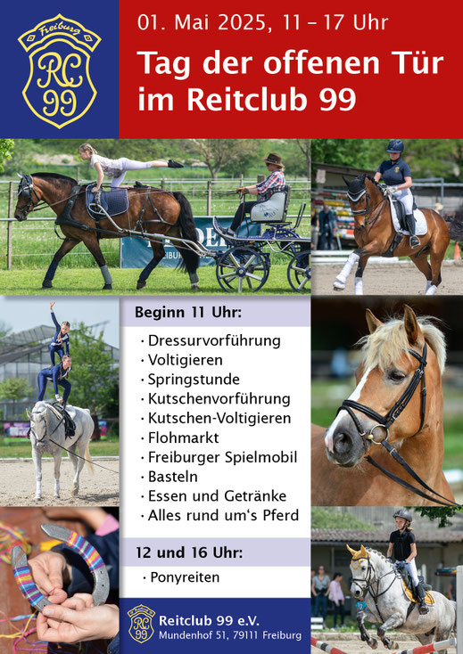 Zwei Tage vor unserem Turnier präsentiert sich der RC99 mit einem vielfältigen Programm für Groß und Klein. Gezeigt werden verschiedene Disziplinen des Pferdesports, es gibt ein Bastel- und Spielangebot für Kinder und für Speisen und Getränke ist ebenfalls gesorgt. Am Mittag und Nachmittag erfreuen wir dann die Kinderherzen mit Ponyreiten. Wir freuen uns auf euren Besuch!