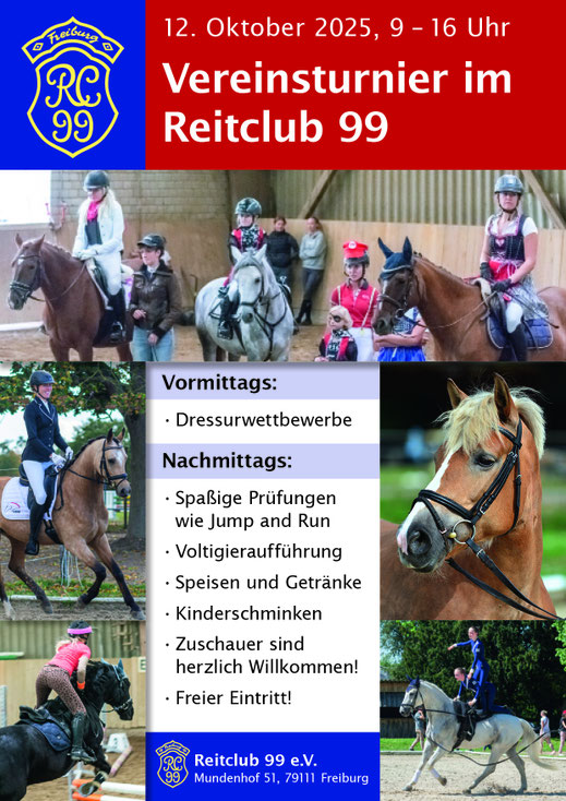 Zwei Tage vor unserem Turnier präsentiert sich der RC99 mit einem vielfältigen Programm für Groß und Klein. Gezeigt werden verschiedene Disziplinen des Pferdesports, es gibt ein Bastel- und Spielangebot für Kinder und für Speisen und Getränke ist ebenfalls gesorgt. Am Mittag und Nachmittag erfreuen wir dann die Kinderherzen mit Ponyreiten. Wir freuen uns auf euren Besuch!